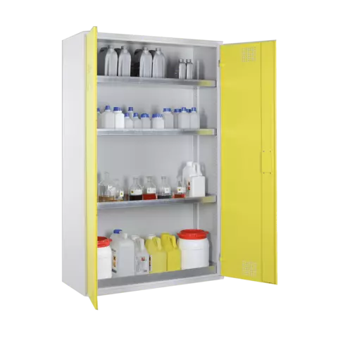 Pour le stockage intérieur sûr et conforme de bidons contenant des liquides dangereux et polluants. Cependant, ces armoires ne conviennent pas au stockage de liquides inflammables.