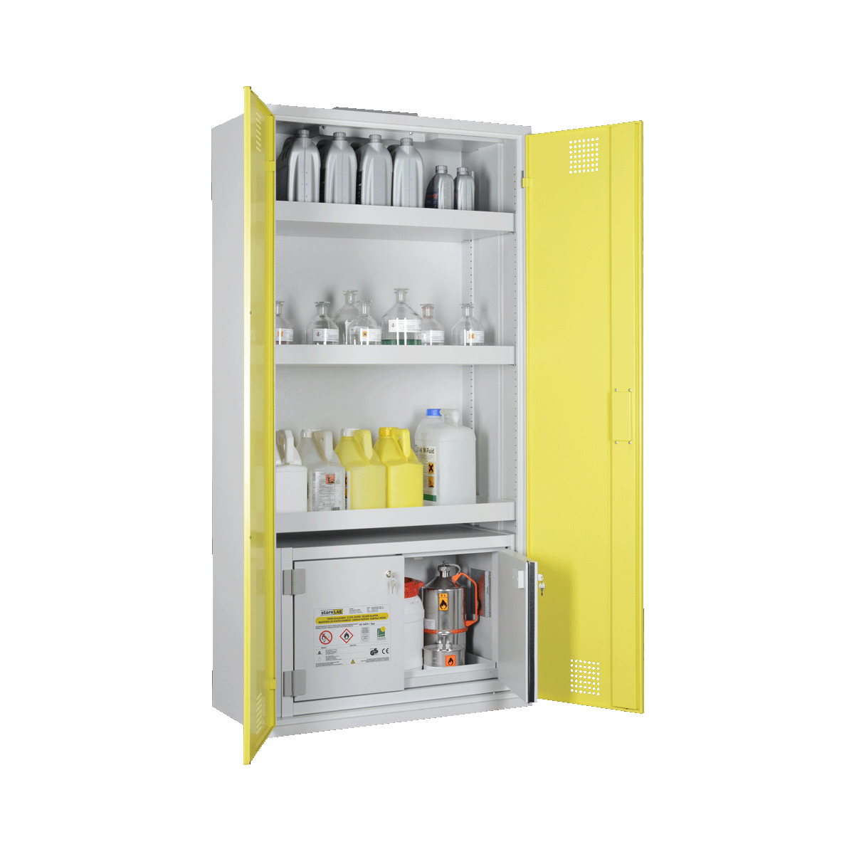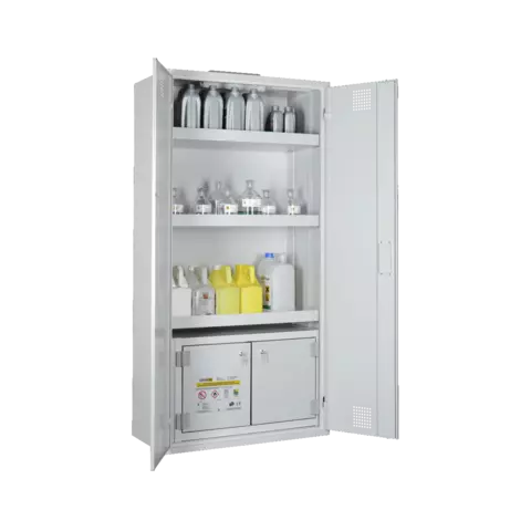 Ces armoires à produits chimiques peuvent être utilisées pour stocker en toute sécurité vos produits chimiques nocifs. Les armoires sont équipées d'un compartiment coupe-feu 30 minutes en partie basse. Ce compartiment convient pour une petite quantité de substances combustibles et inflammables.
