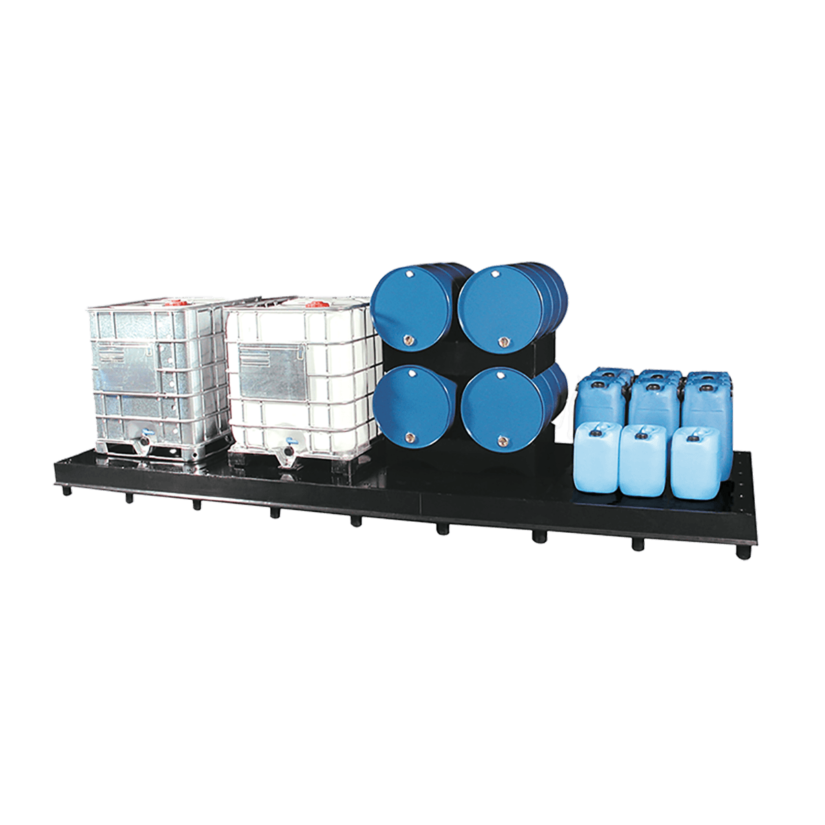 De nombreux produits chimiques sont conditionnés dans des IBC. Dans certains cas, les liquides dangereux ont une densité élevée, ce qui requiert une capacité portante suffisante au niveau des bacs de rétention obligatoires. Ces bacs en PEHD ont une capacité portante très élevée (testée) ainsi qu’une résistance extrême aux substances corrosives. Ils sont donc idéaux pour le stockage d’acides et de bases en IBC