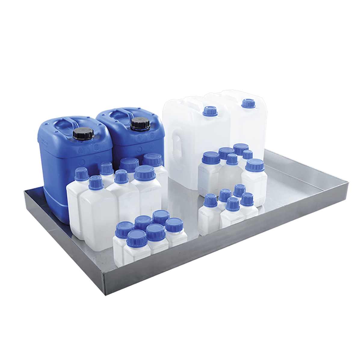 Bacs de rétention pratiques en acier galvanisé pour le rangement de petits récipients. Utilisables partout où il faut un petit encuvement pour maintenir le sol de travail sec et conforme à la réglementation.