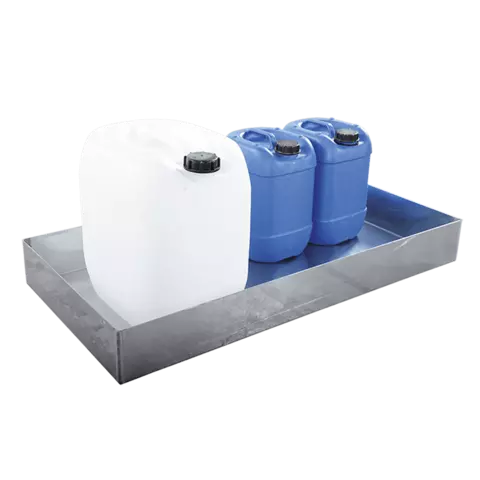 Bacs de rétention pratiques en acier galvanisé pour le rangement de petits récipients. Utilisables partout où il faut un petit encuvement pour maintenir le sol de travail sec et conforme à la réglementation.