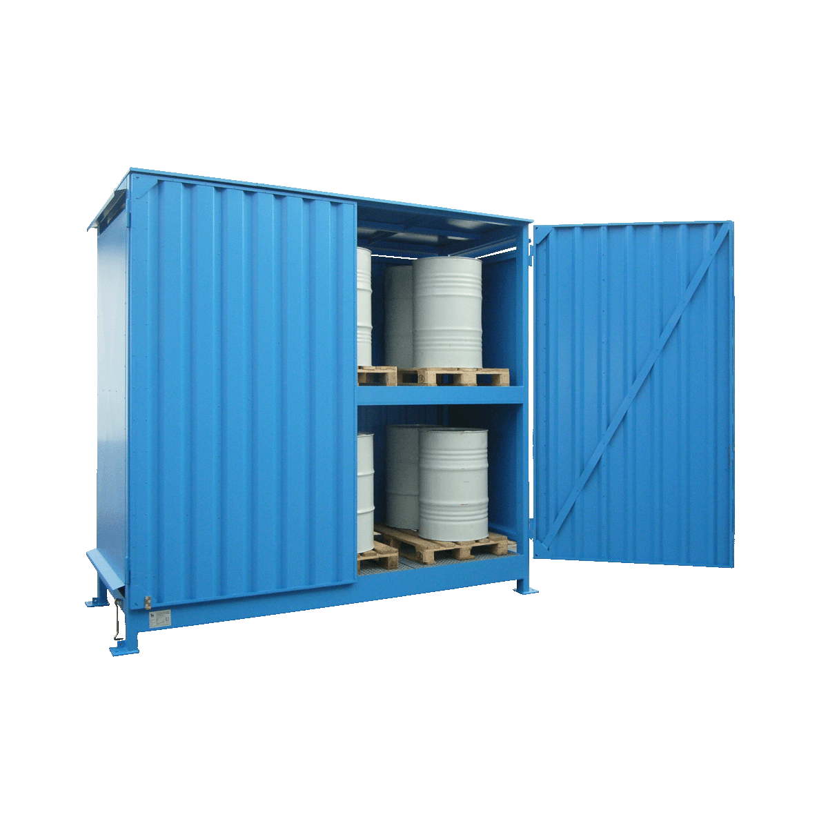 Nos conteneurs en acier ont été spécialement conçus pour le stockage extérieur de substances dangereuses conformément aux normes du Vlarem. Ils peuvent être affectés au stockage de produits inflammables moyennant le respect des règles de distance en vigueur. Grâce à leur polyvalence, les fûts peuvent être stockés directement sur la base grillagée ou sur des europalettes.