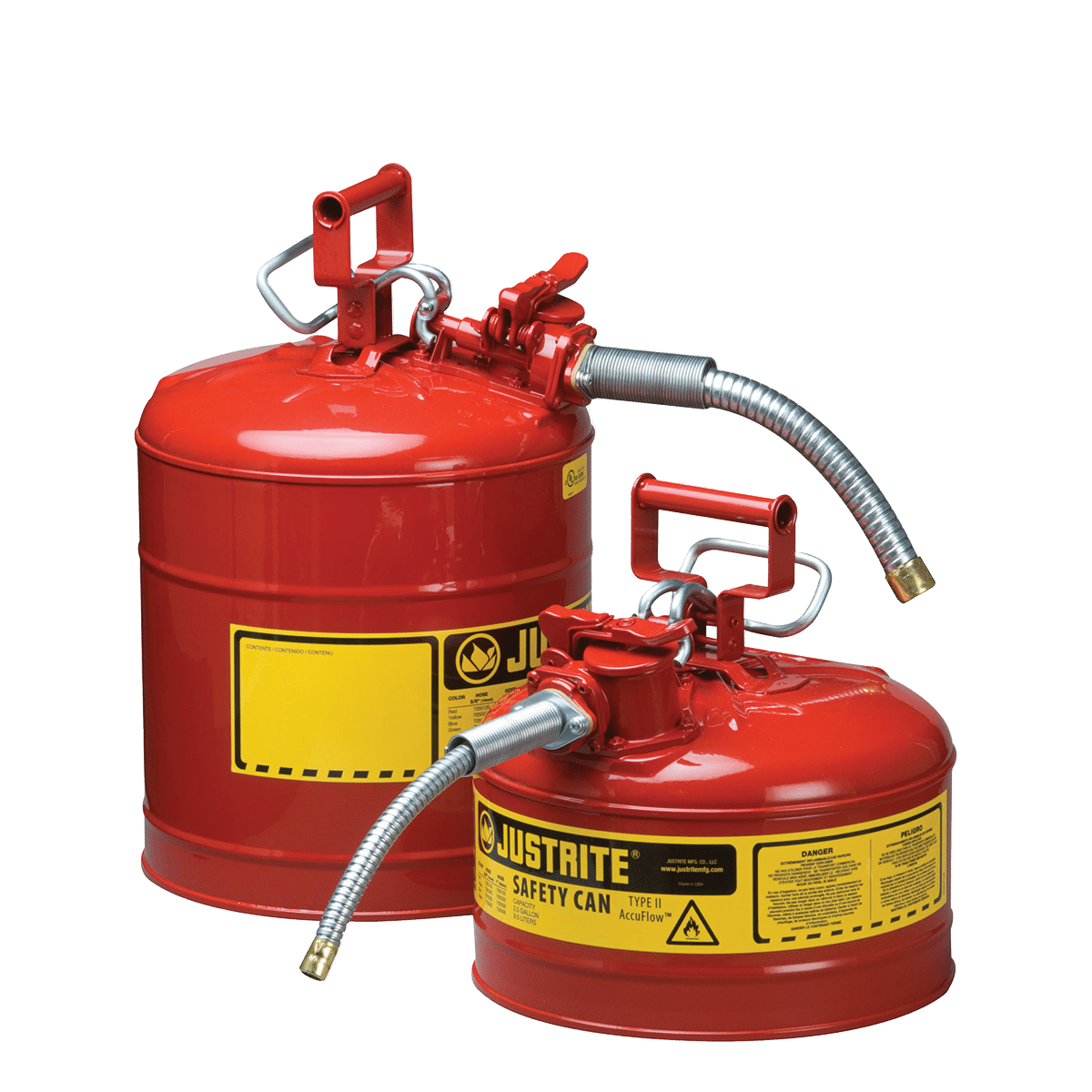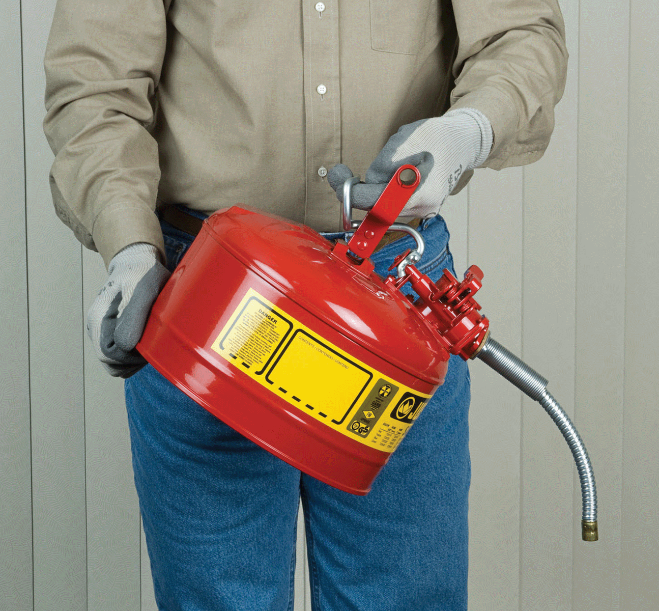 Stalen veiligheidskannen voor ontvlambare stoffen uitgerust met een handige schenktuit. Ideaal voor het gieten in kleine openingen en moeilijk bereikbare vulbuizen. Deze gelakt stalen verdeelkannen hebben een handig Safe-SqueezeTM mechanisme, een trek/duwhendel specifiek ontwikkeld voor het handig vullen en gecontroleerd gieten.