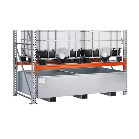Bestaande rekkensystemen kunnen snel en voordelig aangepast worden zodat deze voldoen aan de Vlarem-regelgeving inzake opslag van gevaarlijke producten. Deze opvangbakken zijn speciaal ontwikkeld voor de opstelling tussen bestaande rekstaanders. De bakken zijn verkrijgbaar met of zonder uitneembare roostervloer. Bij de uitvoering zonder roostervloer kan het onderste liggerpaar van het rek dienst doen als opstelling van de pallets net boven de opvangbak. Alle bakken hebben een vrije onderrijhoogte van 100 mm waardoor ze gemakkelijk te verplaatsen zijn met heftruck of transpallet.