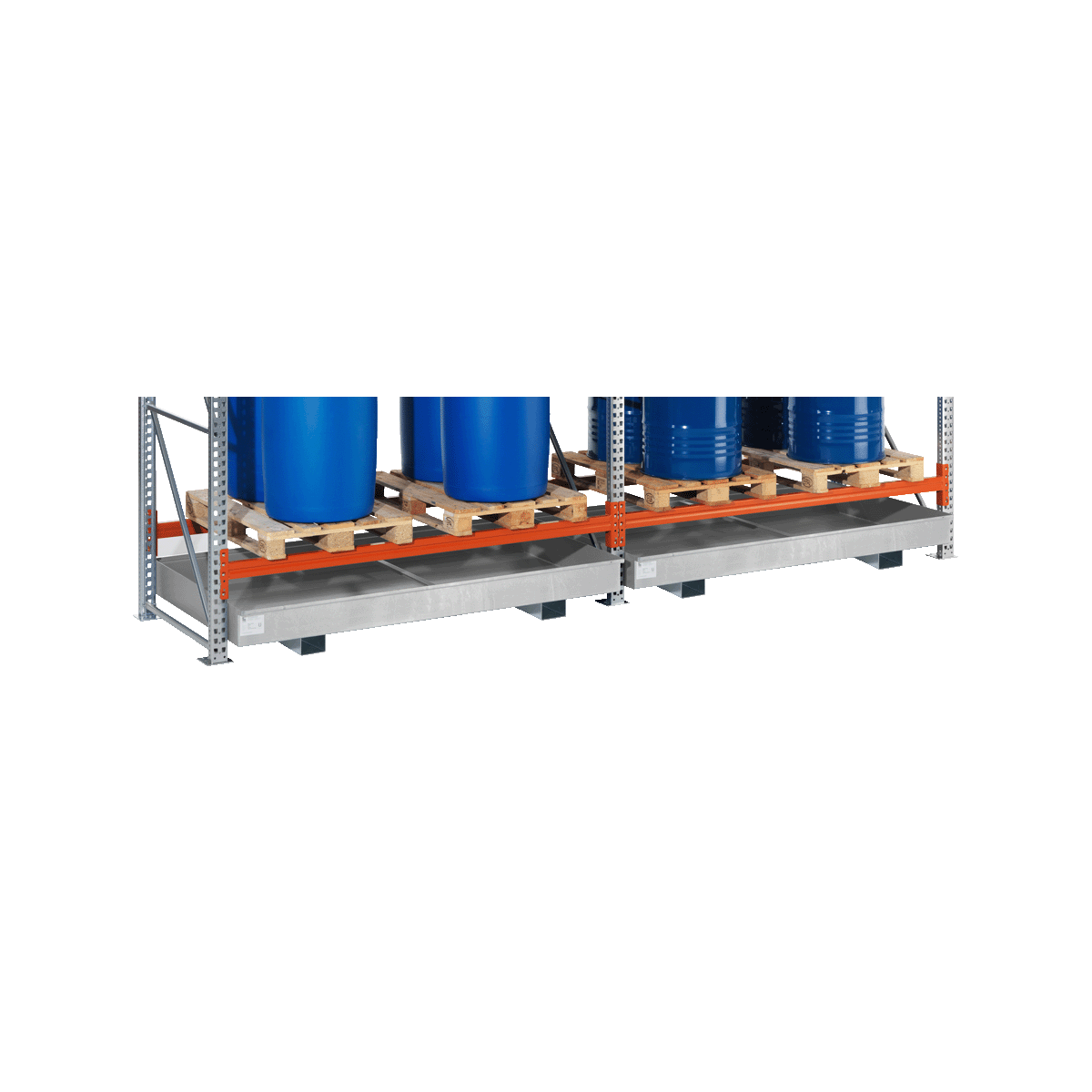 Bestaande rekkensystemen kunnen snel en voordelig aangepast worden zodat deze voldoen aan de Vlarem-regelgeving inzake opslag van gevaarlijke producten. Deze opvangbakken zijn speciaal ontwikkeld voor de opstelling tussen bestaande rekstaanders. De bakken zijn verkrijgbaar met of zonder uitneembare roostervloer. Bij de uitvoering zonder roostervloer kan het onderste liggerpaar van het rek dienst doen als opstelling van de pallets net boven de opvangbak. Alle bakken hebben een vrije onderrijhoogte van 100 mm waardoor ze gemakkelijk te verplaatsen zijn met heftruck of transpallet.