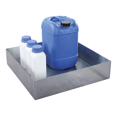 Handige opvangschalen uitgevoerd in verzinkt staal voor de opstelling van kleine recipiënten. Overal inzetbaar waar een kleine inkuiping gewenst is om de werkvloer droog en conform de regelgeving te houden.