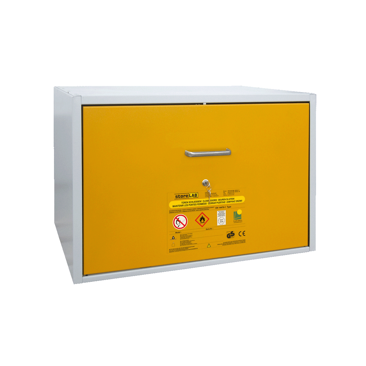 - Buitenzijde staal afgewerkt met chemische resistentie poedercoating in grijs (RAL 7035) of deuren geel (RAL 1007)