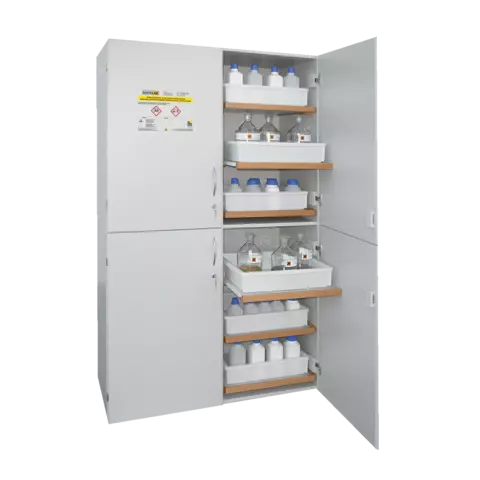 Zuren-en logen zijn beide corrosieve stoffen maar moeten toch gescheiden van elkaar worden gestockeerd om chemische reacties en warmtevorming te vermijden. Onze zuren-en logen kasten bieden hier de perfecte oplossing voor een gecombineerde opslag. De constructie uit HPL platen garandeert een lange levensduur.