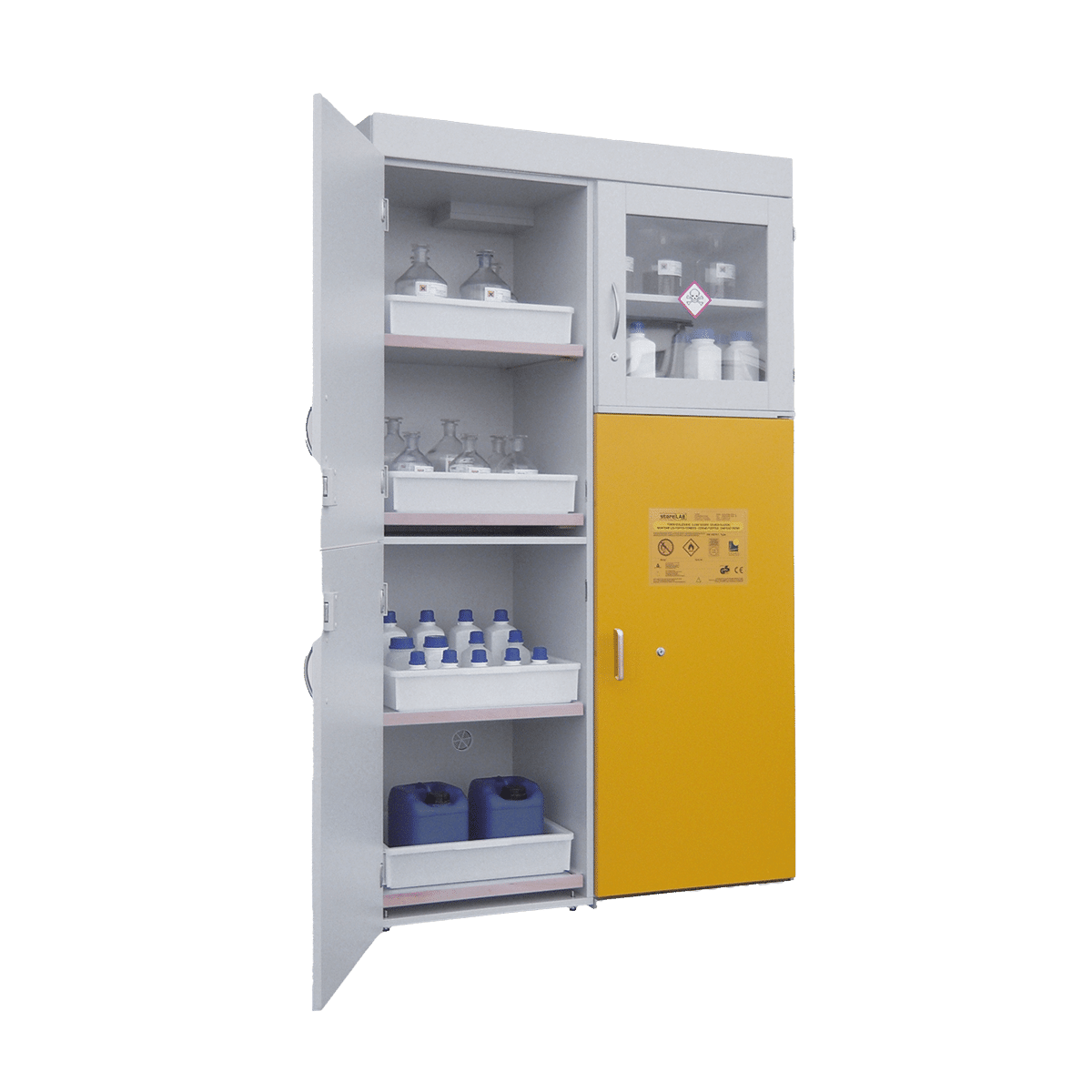 - Buitenzijde staal afgewerkt met chemische resistentie poedercoating in grijs (RAL 7035) of deuren geel (RAL 1007)